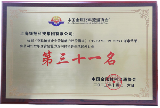 中國金屬材料流通協(xié)會(huì) 2022年度營銷能力及鋼鐵銷售業(yè)績位列行業(yè)第三十一名