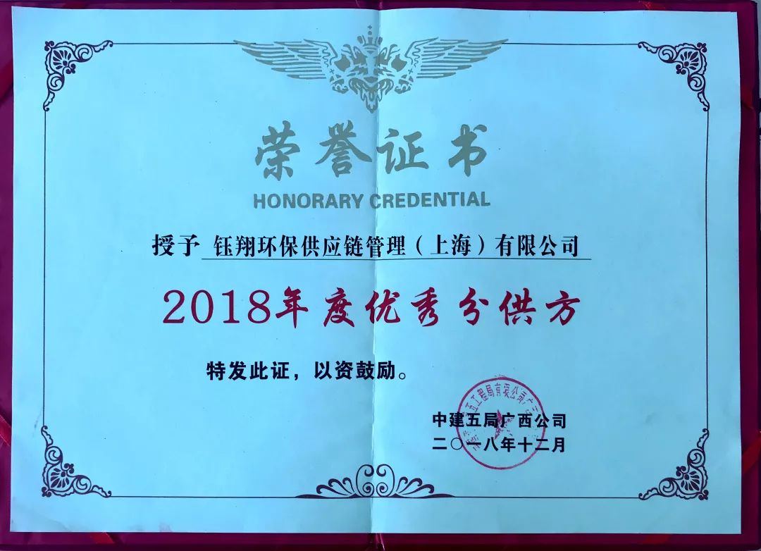 鈺翔環保供應鏈管理(上海)有限公司被中建五局廣西公司評為優秀分供方