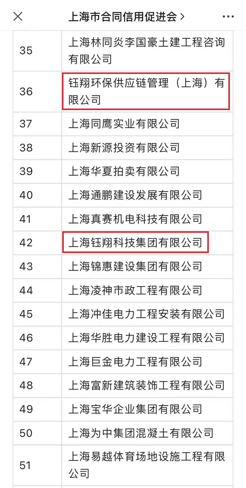 上海鈺翔科技集團有限公司始終堅持追求陽光下的利潤核心價值觀,本次獲評上海市守合同重信用企業是對企業誠信建設的充分肯定,我們將以此為契機,通過進一步加強信用合同管理,完善誠信體系建設,再接再厲,不斷提升企業誠信建設水平,為城市建設、行業發展做出應有的貢獻。
