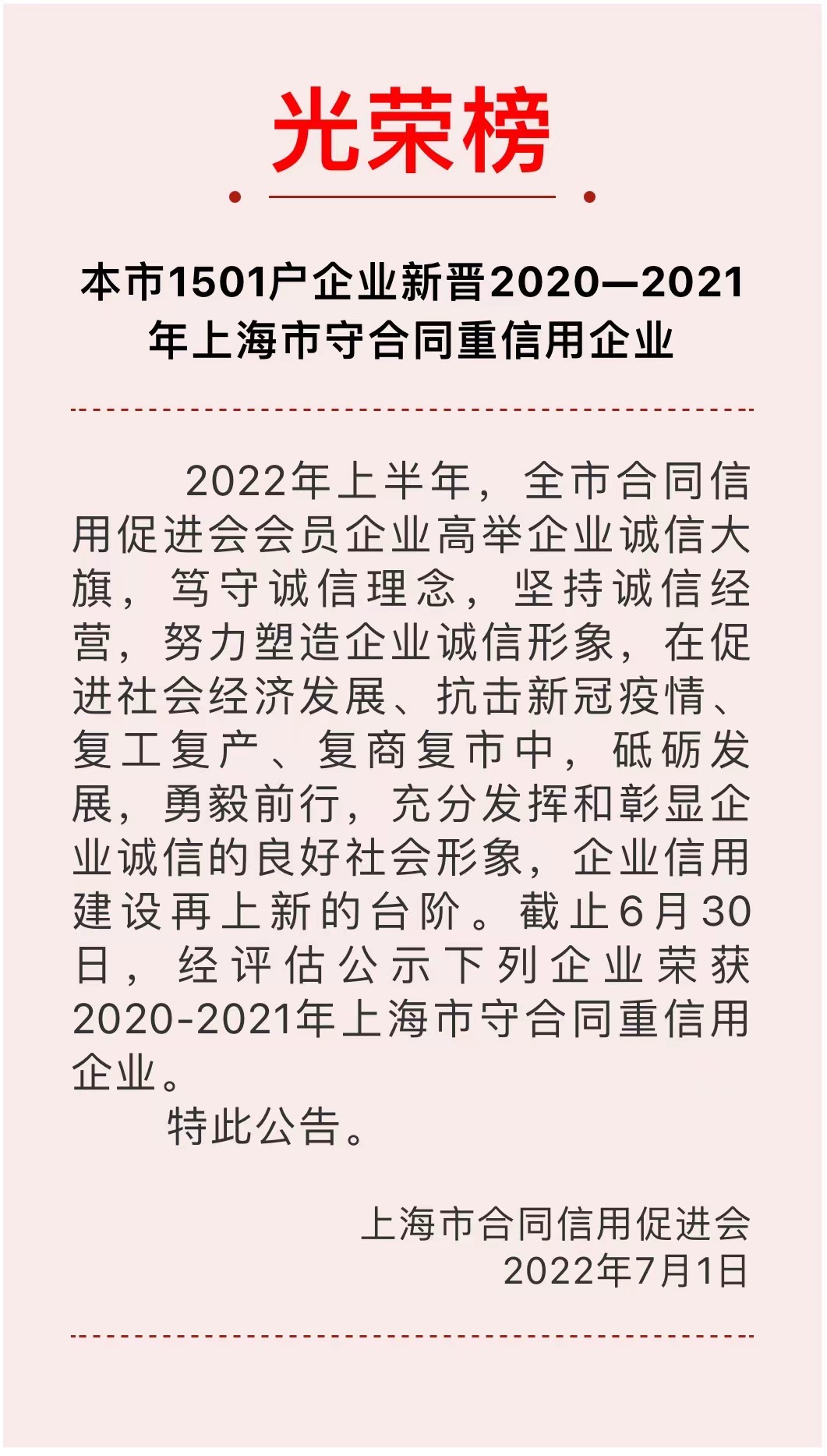 71日,上海市合同信用促進會公示了上海市1501戶企業新晉2020-2021年上海市守合同重信用企業光榮榜。